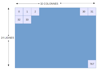 Ces positions vont de gauche à droite (comme le fonctionnement d’une machine à écrire), de la position 0 à 31 pour la première ligne, puis passe à la ligne 2 et poursuit la numérotation jusqu’à la dernière position N° 768 en bas à droite.