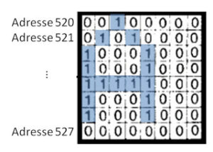 Si on voulait modifier la forme du ‘A’ il faudrait que l’on modifie les valeurs des adresses 520 à 527 (8 octets), mais on va pas le faire dans notre exemple.