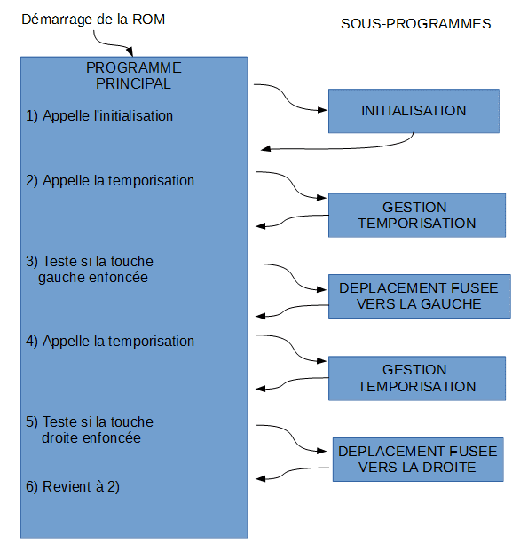 Si pendant cette boucle infinie, une touche directionnelle est enfoncée alors on fait appel à la routine de déplacement de la fusée.