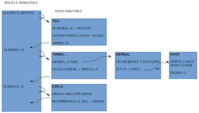 Et la boucle principale appelle la routine de déplacement de la balle (ou du laser si vous préférez).